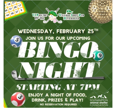 50% of proceeds from BINGO night at Village Idiot Pub, in Riverhead, will be donated directly to SASF 🐾 Head down at 7pm for a chance to win prizes, enjoy drinks and some good eats – all while helping the animals of SASF 😊