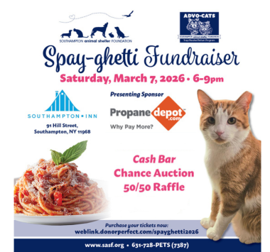It’s that time of year to raise critical funds for our Advo-Cats Program! Join SASF at the Southampton Inn on March 7th. $40 Adult Ticket includes spaghetti buffet dinner and dessert ($20 Child Ticket available for ages 12 and under!) Interested in Sponsoring? Contact donations@sasf.org
