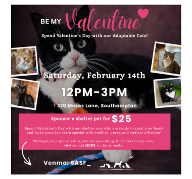 Spend your Valentine’s Day from 12PM–3PM with our shelter cats who are ready to steal your heart and make your day extra special with cuddles, purrs, and endless affection! There will be a bake sale, too! No Registration Required – Just Stop By! Sponsor a Cat as a Valentine’s Day gift! Donate Here