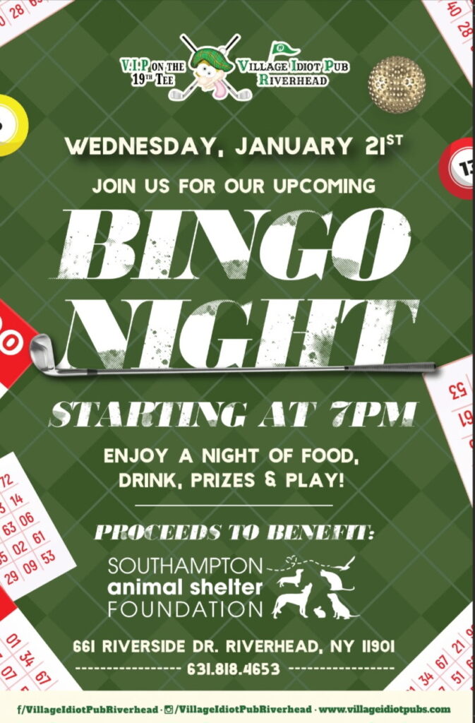 50% of proceeds from BINGO night at Village Idiot Pub, in Riverhead, will be donated directly to SASF 🐾