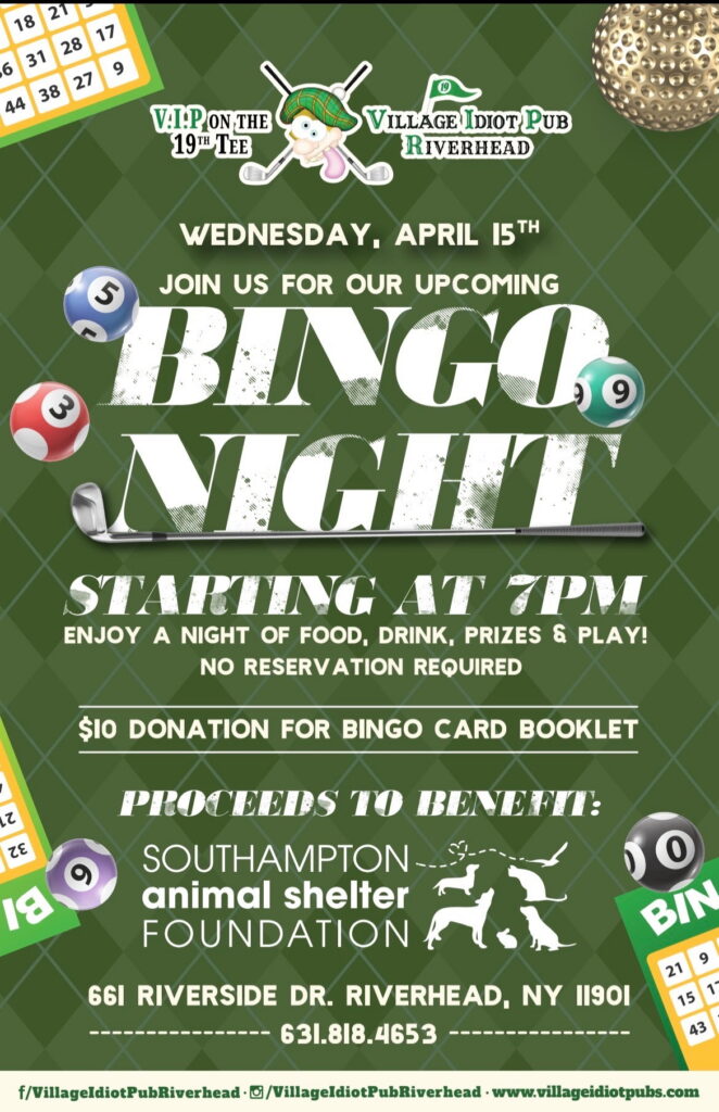 50% of proceeds from BINGO night at Village Idiot Pub, in Riverhead, will be donated directly to SASF 🐾