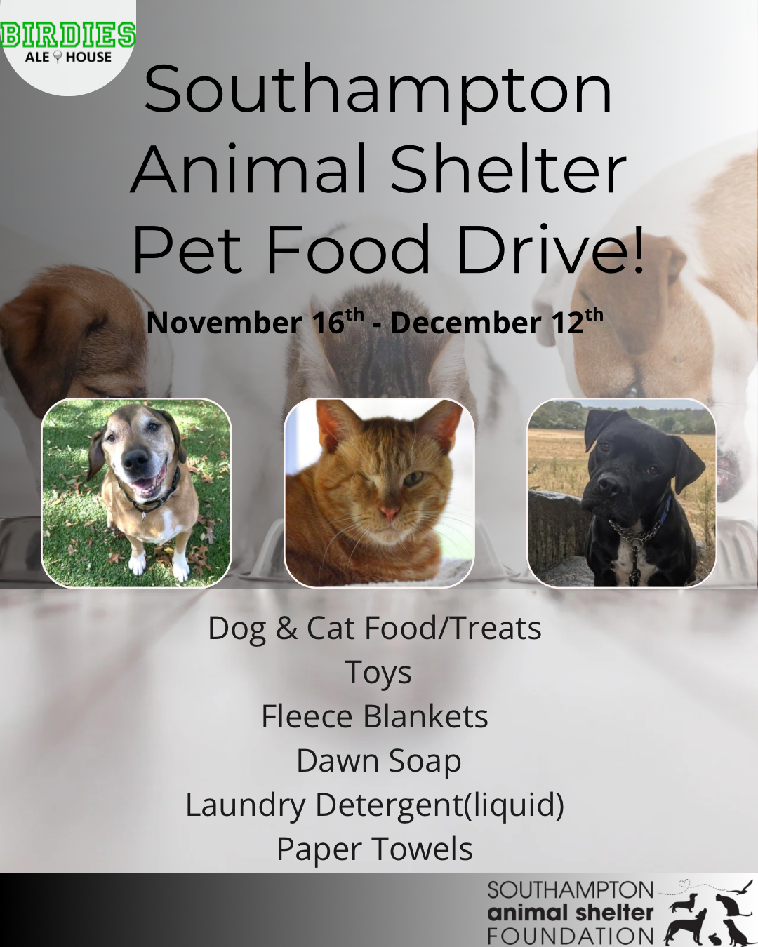 Kick off the holiday season with us at Birdies Ale House Friendsgiving event! Enjoy food, drinks, and good company while helping SASF animals in need with the launch of their holiday donation drive🐾