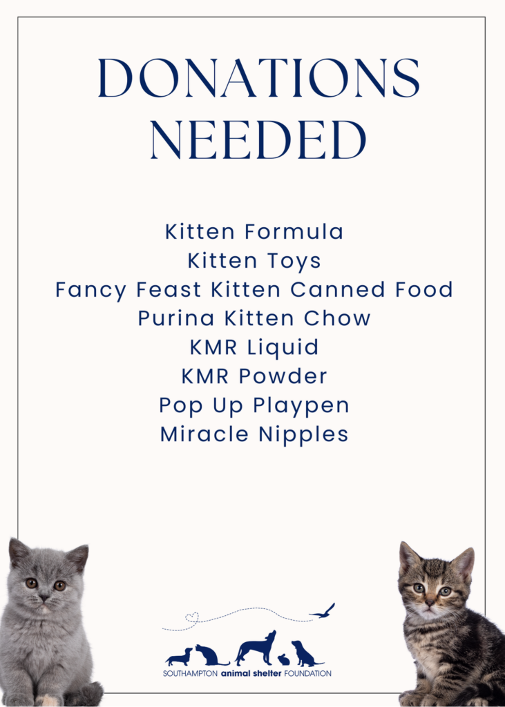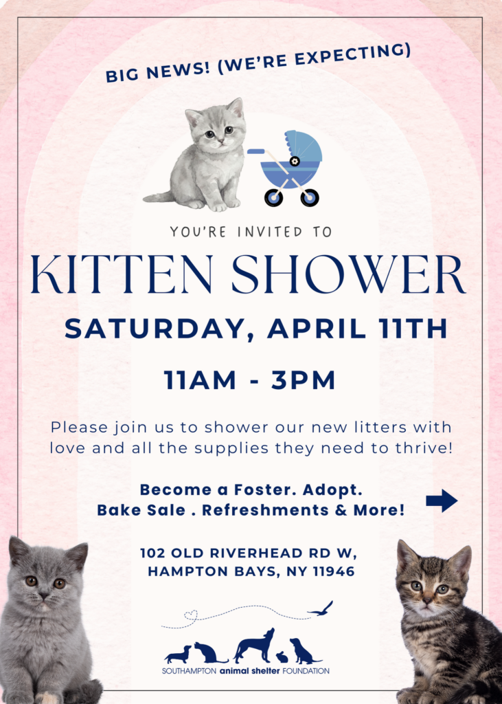 Kitten Shower You’re Invited to SASF’s Kitten Shower! Come shower our kitties to be with some love, and donating items off our Amazon Wish List! + Add to Google Calendar + iCal / Outlook export Date Apr 11 2026 Time 11:00 am - 4:00 pm More Info View Our Amazon Wish List Location Southampton Animal Shelter Foundation 102 Old Riverhead Road West Category Featured Event View Our Amazon Wish List + Add to Google Calendar + iCal / Outlook export Share this event