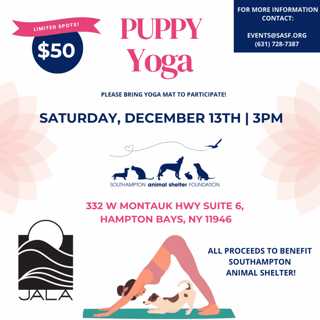 From JALA: Please bring a yoga mat, water and wear light clothes. The room is not heated (for the puppies).