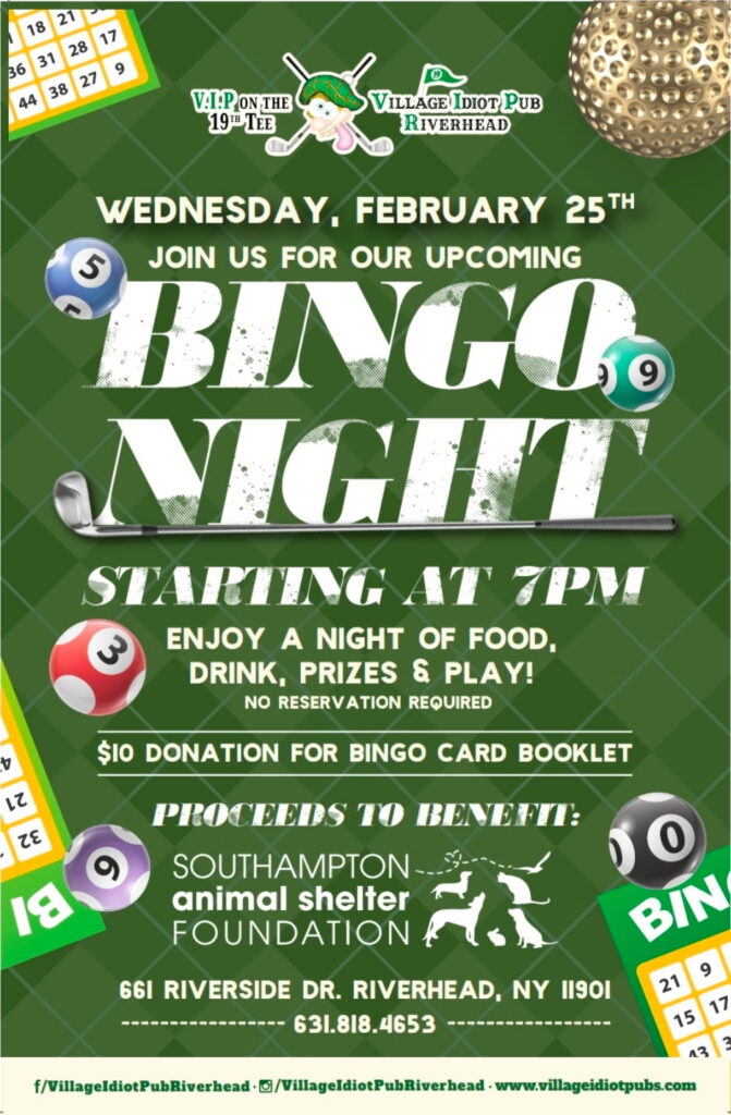 50% of proceeds from BINGO night at Village Idiot Pub, in Riverhead, will be donated directly to SASF 🐾